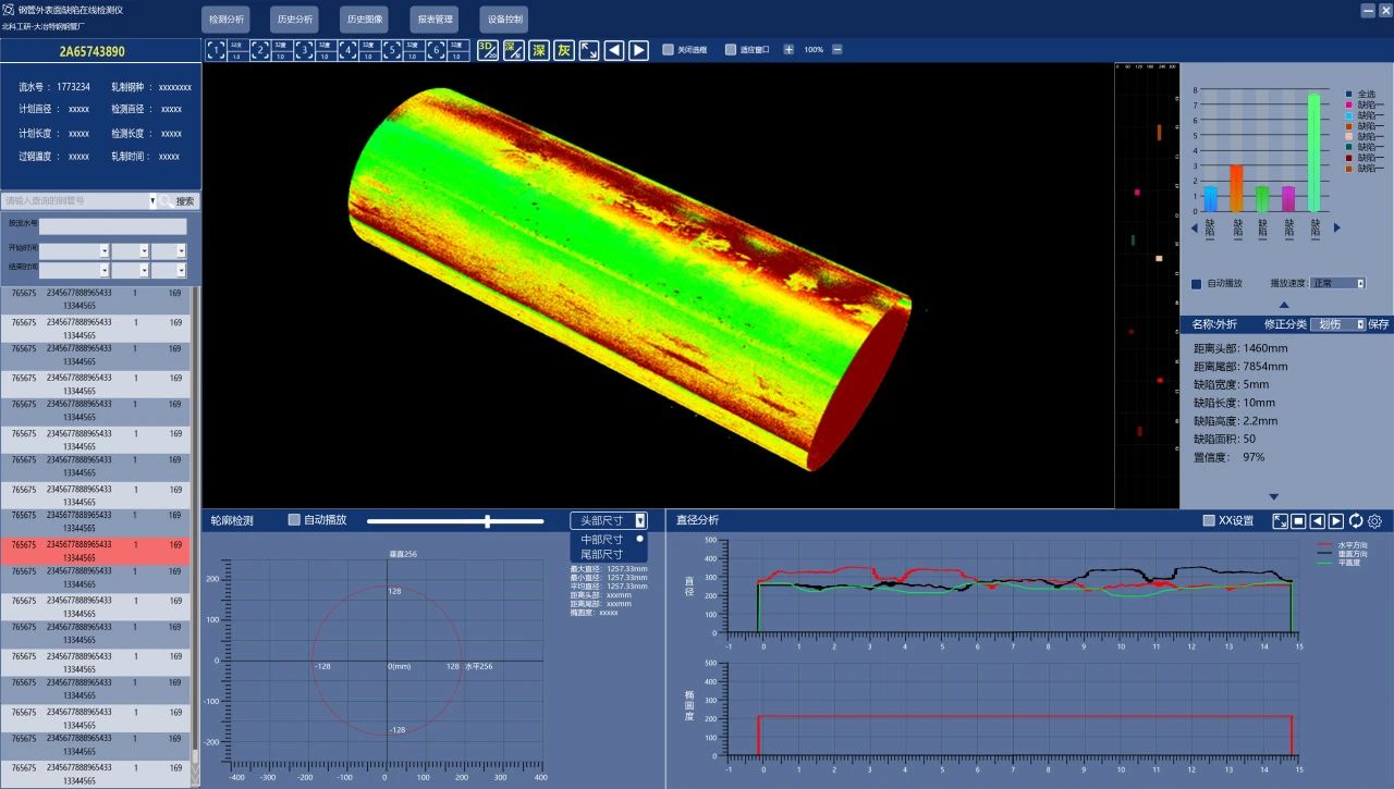 針對460產線小批量生產、規格多、變徑大產生的圖像變化大等難題,開發了多相機自適應標定技術、快速3D點云處理技術、AI+3D深度信息融合的11種缺陷檢測模型,來適應現場不同類型缺陷的精準識別,經現場使用驗證可檢測凹坑、軋疤、外螺、擦劃傷、指甲印傷等各種典型表面缺陷,且檢出率99%以上。同時還可實現斷面0°、90°、45°、135°多角度的管徑自動測量,結合軋機軋制方向給出相對應的外徑值,給現場軋制提供尺寸指導。系統強大的綜合檢測能力,極大的方便了生產人員進行生產數據分析和在線質量管控。