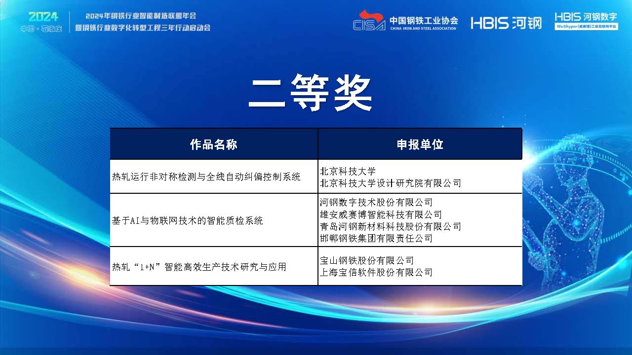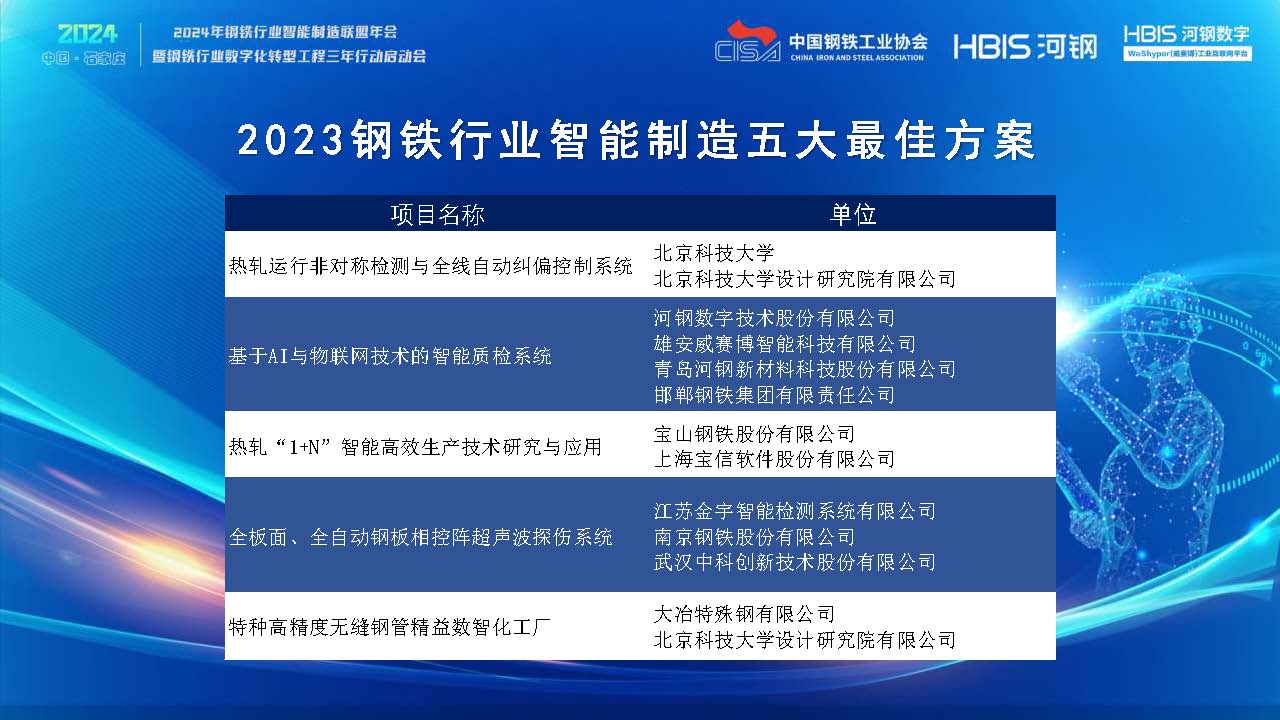 4月1日-2日,由中國鋼鐵工業協會、智能制造系統解決方案供應商聯盟鋼鐵行業分盟主辦的“2024年鋼鐵行業智能制造聯盟年會暨鋼鐵行業數字化轉型工程三年行動啟動會”在河北石家莊成功召開。會上,舉行了第三屆智能制造創新大賽(鋼鐵行業賽道)和智能制造聯盟2023年工作突出貢獻單位及個人頒獎儀式并發布了2023鋼鐵行業智能制造十大優秀方案、五大最佳方案。
