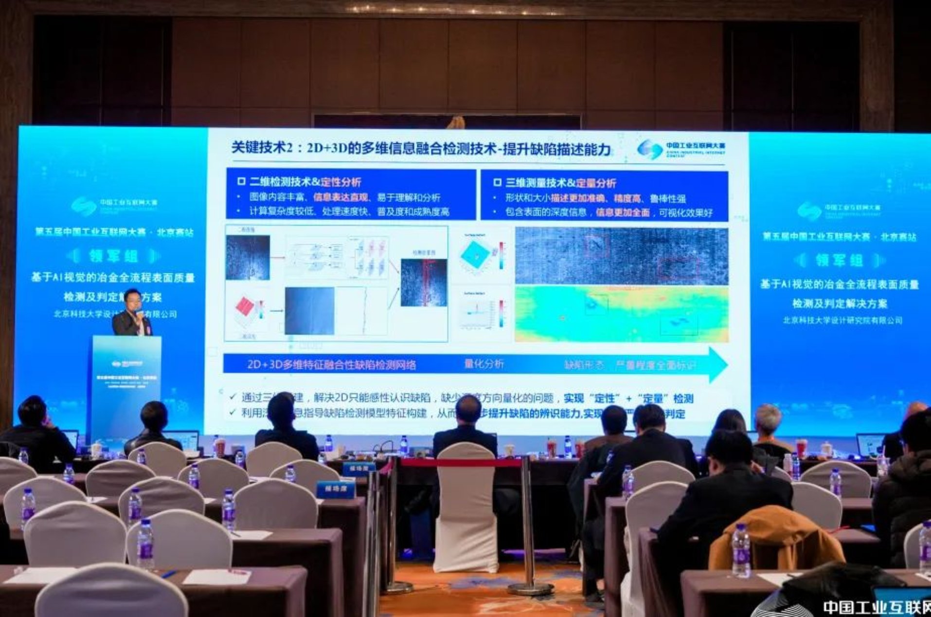 11月17日,由工業和信息化部、國務院國有資產監督管理委員會等主辦的以“數字賦能、智創未來”為主題的第五屆工業互聯網大賽,北京賽區全國賽在北京石景山萬達嘉華酒店召開。北科工研智能檢測團隊攜“基于AI視覺的冶金全流程表面質量檢測及判定解決方案”和來自全國各地實力強勁的36支隊伍同臺競技,獲得北京賽站領軍組二等獎。